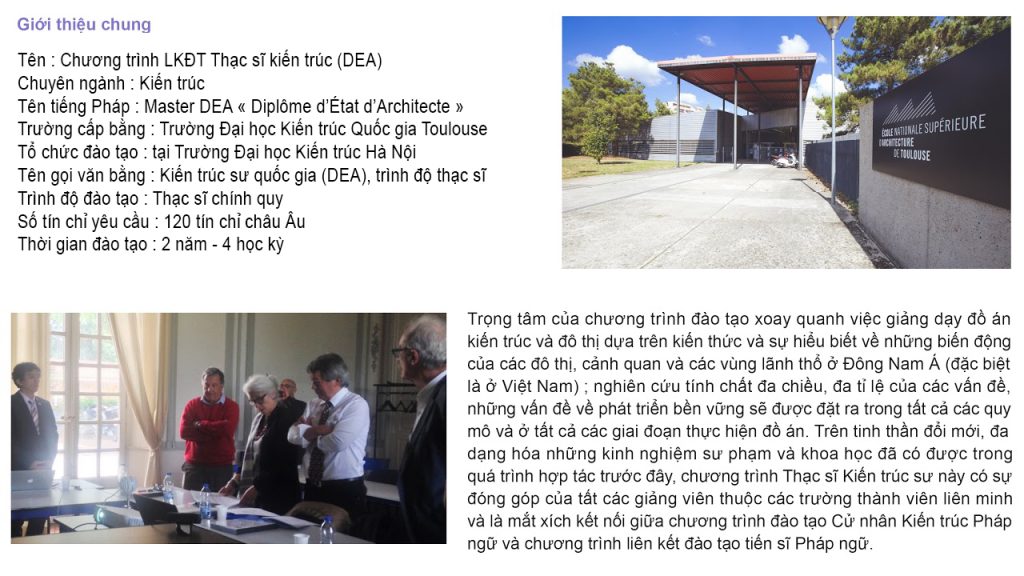 – Học viên được đăng ký học trao đổi năm thứ hai tại Trường Đại học Kiến trúc Quốc gia Toulouse (Cộng hoà Pháp).