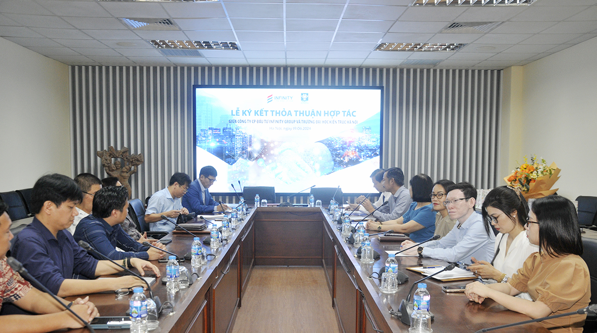 Với mục đích hỗ trợ sinh viên trong thực tập và tạo cơ hội việc làm, xây dựng quỹ học bổng cho sinh viên và học viên của Nhà trường, góp phần nâng cao chất lượng đào tạo và cung ứng nguồn nhân lực chất lượng cho ngành xây dựng; sáng 19/6/2024, Phó Hiệu trưởng Trường Đại học Kiến trúc Hà Nội (HAU) – PGS.TS.KTS. Nguyễn Tuấn Anh và ông Trần Oanh – Phó Tổng Giám đốc thường trực Công ty Cổ phần đầu tư Infinity Group (IFG) đã cùng ký Thỏa thuận hợp tác dưới sự chứng kiến của đại diện hai bên.