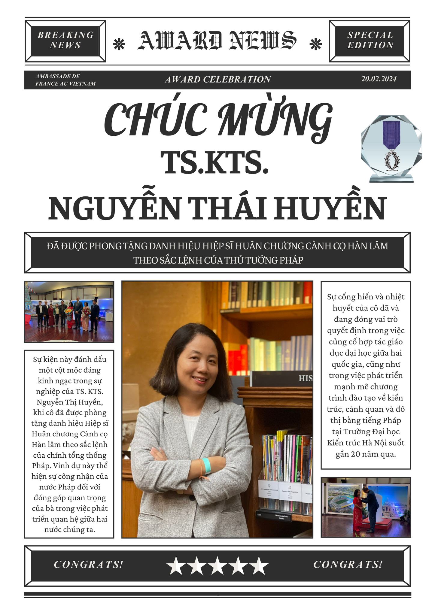 Một lần nữa, Trường Đại học Kiến trúc Hà Nội xin được chúc mừng cô Nguyễn Thái Huyền khi đã nhận được danh hiệu cao quý này.