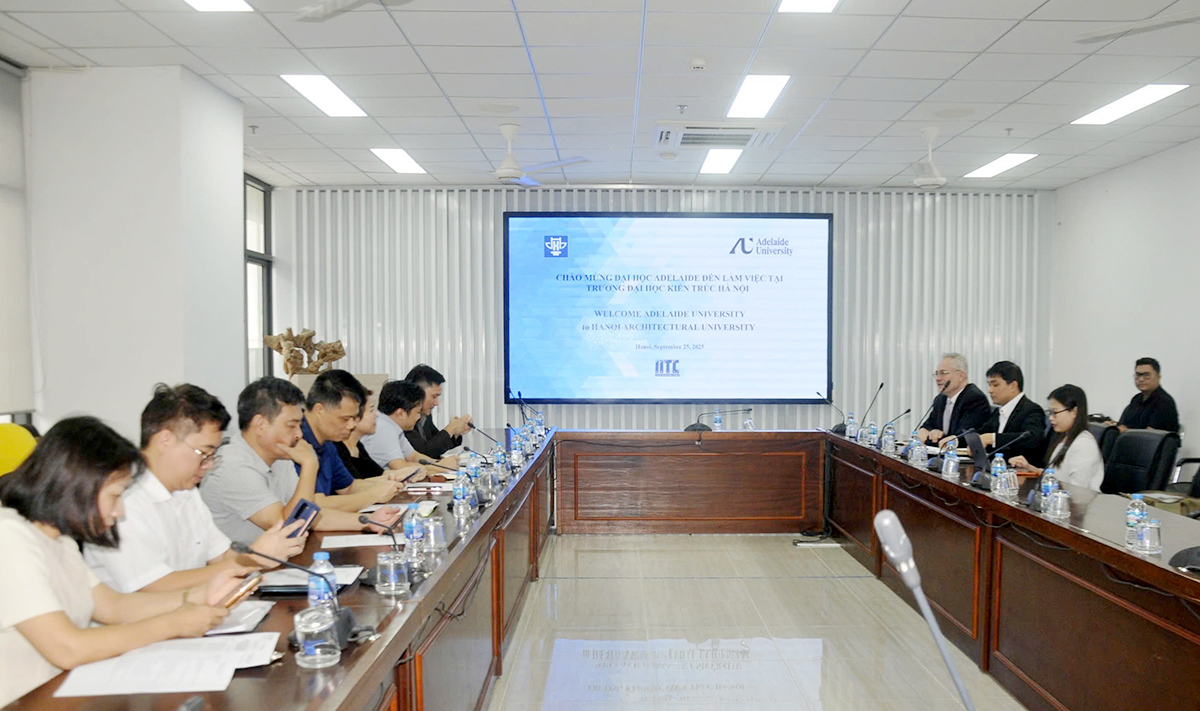 Sáng 25/9/2025, Hiệu trưởng Trường Đại học Kiến trúc Hà Nội (HAU) – PGS.TS.KTS. Lê Quân đã tiếp và làm việc với GS. Scott Smith – Phó Hiệu trưởng phụ trách Quan hệ quốc tế, Trường Khoa học kỹ thuật và Công nghệ, Đại học Adelaide, Úc cùng đoàn công tác đến thăm và làm việc với lãnh đạo Nhà trường. Cùng đi với GS. Scott Smith có PGS.TS. Phạm Thông và bà Tâm Nguyễn – Cán bộ phụ trách các chương trình chuyển tiếp thuộc Tổ chức giáo dục quốc tế (TET Education Group).